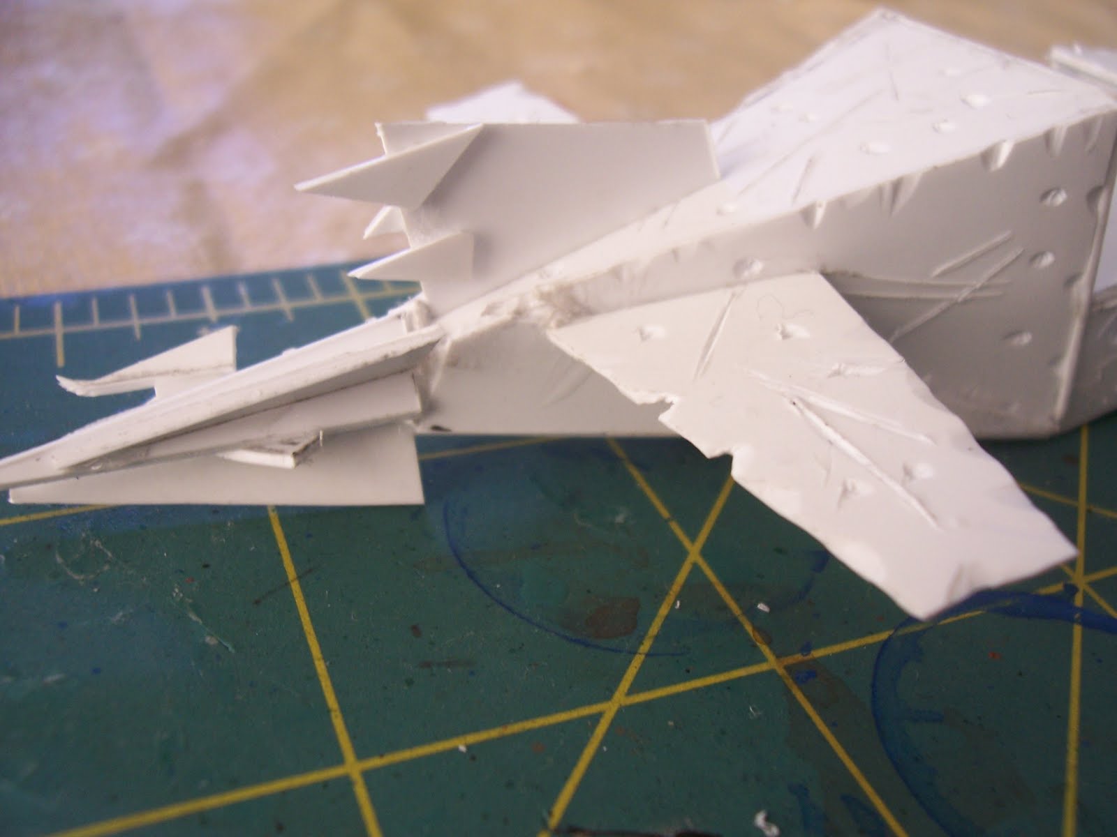 These pics are admittedly not great, but by tapering the end of the aircraft to an even further degree than what I was doing previously, and adding a jet (which is just a piece of tube with lots of plasticard bitz plied on) it adds quite a bit to the mini. Additionally while I was working on it a triangular bit fell and landed on the top rudder. I liked the look of it and added a couple more, which gives the aircraft even more of an Orky flair.